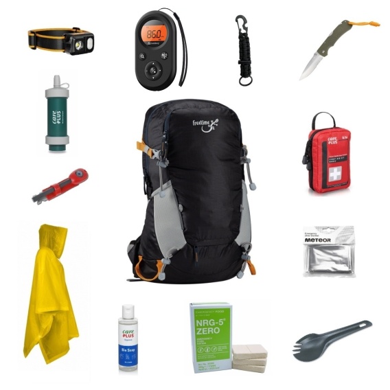 Zestaw ewakuacyjny oparty na plecaku turystycznym Freetime Peak 32. Skonfigurowany tak, aby wspierać w sytuacjach kryzysowych i jednocześnie sprawdzać się podczas zwykłych aktywności outdoorowych. Wyposażenie obejmuje elementy przydatne w ewakuacji, jak i podczas wycieczek w góry, na rower czy biwak.