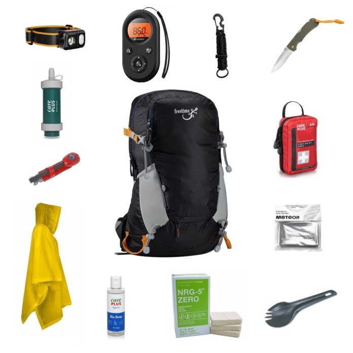 Bazą zestawu jest plecak Freetime Peak 32 w kolorze czarnym. W przeciwieństwie do typowych plecaków taktycznych nie ma militarnego wyglądu, co pozwala zachować dyskretny, cywilny charakter w razie konieczności ewakuacji. Jego zaletą jest uniwersalność – to model, który można z powodzeniem wykorzystywać także w spokojnych warunkach, jako plecak na turystyczne wypady.