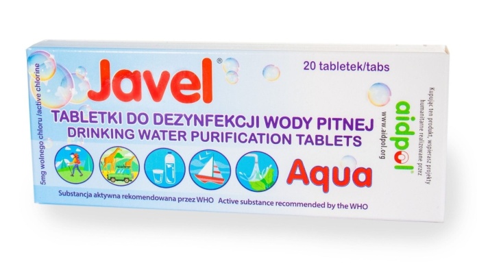 Tabletki do uzdatniania wody Javel Aqua to skuteczny i łatwy w użyciu środek przeznaczony do dezynfekcji wody pochodzącej z niepewnych lub nieznanych źródeł. Sprawdzą się w sytuacjach kryzysowych, podczas klęsk żywiołowych, przerw w dostawie wody, a także w podróżach, biwakach czy wyprawach survivalowych. Zawierają substancję aktywną NaDCC, rekomendowaną przez Światową Organizację Zdrowia (WHO) w wytycznych dotyczących jakości wody pitnej.